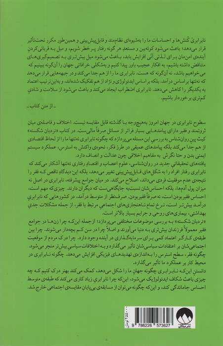 نابرابری کُنشها و احساسات ما را بهشیوهای نظاممند و قابلپیشبینی و همینطور مکرر تحتتأثیر قرار میدهد؛ باعث میشود کوتهبین و مستعدِ هر گونه رفتار پرخطر شویم، و میل به قربانیکردنِ آیندهی امنمان برای لذتی آنّی افزایش یابد، باعث میشود میل بیشتری به تصمیمگیریهای متناقض داشته باشیم، به افکار عجیب باور پیدا کنیم و بهشکلی خرافاتی جهان را آنگونه ببینیم که میخواهیم باشد، نه آنگونه که هست. نابرابری ما را از هم جدا میکند و در جبهههایی قرار میدهد که نهتنها براساس درآمد، بلکه براساس ایدئولوژی و نژاد از هم تفکیک شدهاند، و بهاینترتیب اعتماد به یکدیگر را کاهش میدهد. نابرابری اضطرابآور است و باعث میشود از سلامت و شادیِ کمتری برخوردار باشیم.