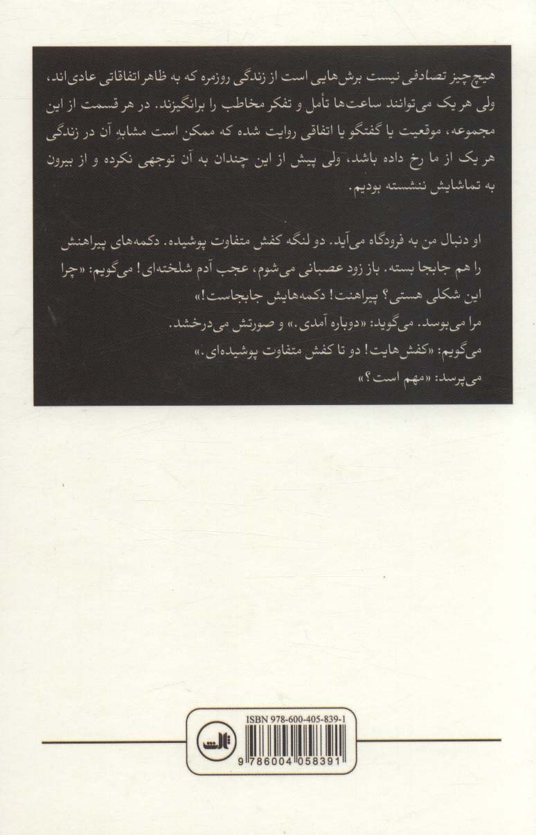 او دنبال من به فرودگاه میآید. دو لنگه کفش متفاوت پوشیده. دکمههای پیراهنش را هم جابجا بسته. باز زود عصبانی میشوم، عجب آدم شلختهای! میگویم: «چرا این شکلی هستی؟ پیراهنت! دکمههایش جابجاست!»